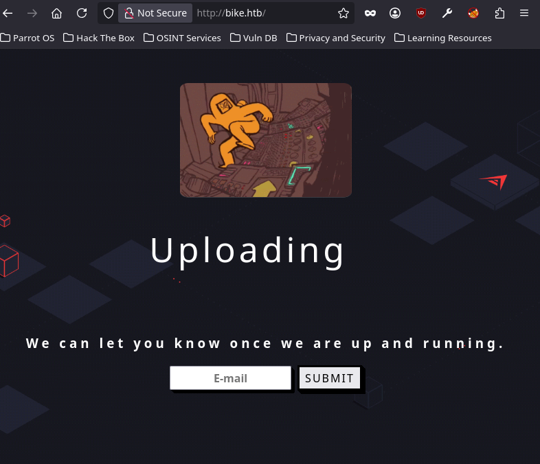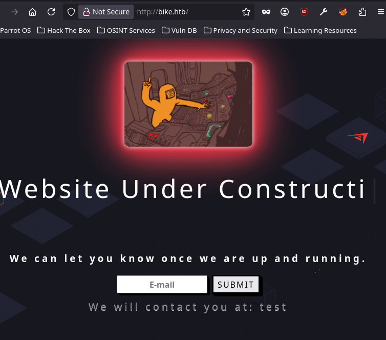 En ouvrant http://bike.htb dans le navigateur, on découvre un site en construction avec un simple formulaire d’inscription à une newsletter.