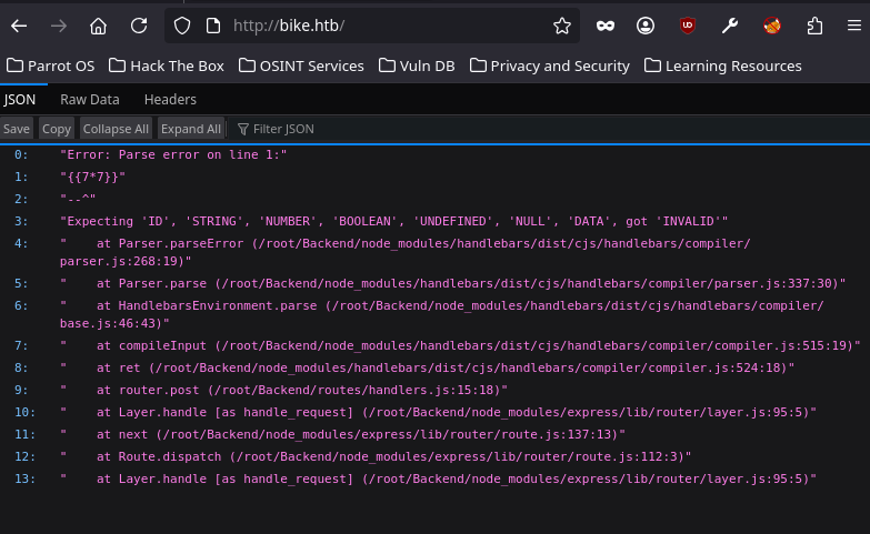 On n’obtient pas 49 mais une erreur. Le serveur a bien tenté d’évaluer l’expression, la syntaxe {{ }} est reconnue mais a planté. Le message d’erreur est encore plus révélateur : il mentionne le chemin /routes/Backend/ et le nom du moteur : Handlebars.