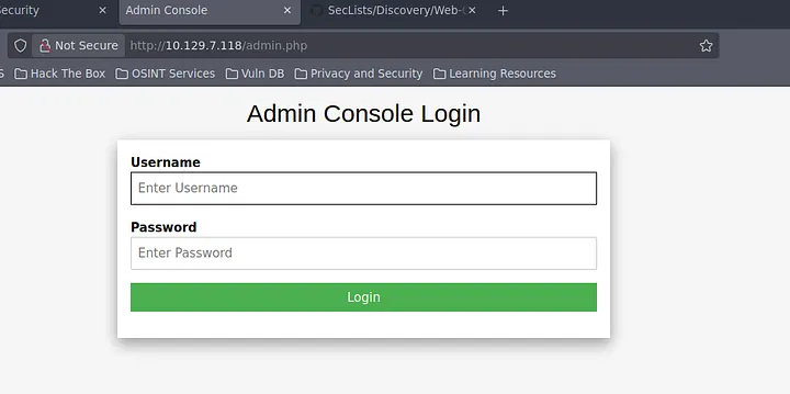 On se rend donc sur http://10.129.7.118/admin.php. On se retrouve face à un formulaire de connexion.