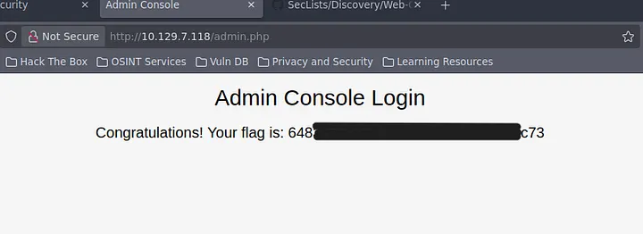 ===============================================================Hop ! Gobuster a trouvé un fichier très suspect : /admin.php. Le code Status: 200 nous confirme que la page est bien là et qu’on a le droit d’y accéder.