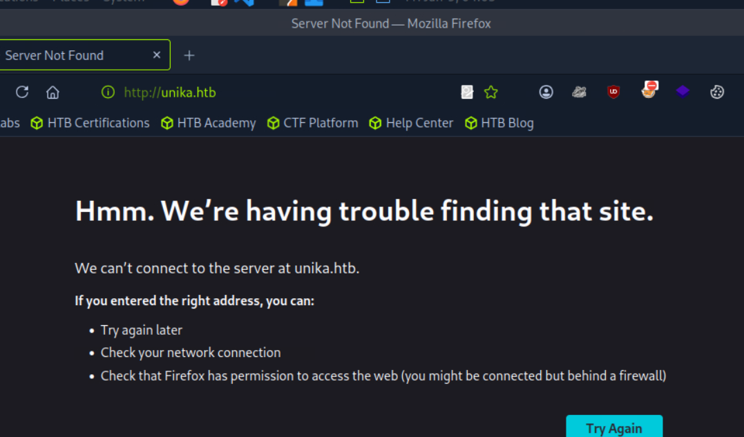 En accédant à l’IP via un navigateur, on tombe sur une erreur de redirection vers unika.htb.